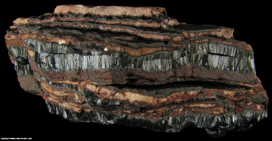 This specimen is composed of banded layers of black Goethite and iron stained massive Quartz. The top surface of the specimen is black botryoidal Goethite with a high luster. Each of the spheres is composed of very small plate like crystals. The specimen is in fairly good condition but part of the top surface has a reddish overcoat.